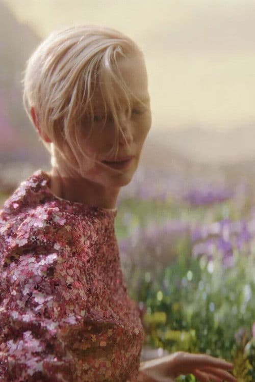 A woman watches as barren landscape is reborn, perhaps by her doing.