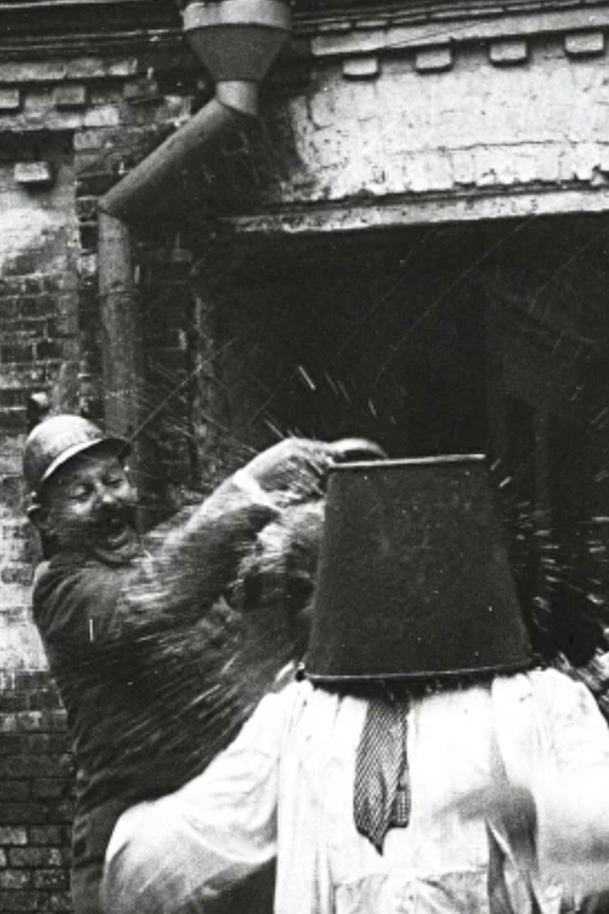 The bald man becomes a cameraman for a newsreel.